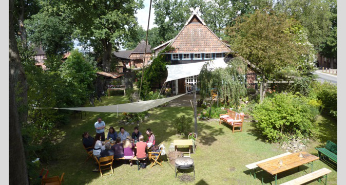 Unter alten Eichen mitten im alten Dorfkern liegt das Fachwerkhaus von 1702. Ein Treppenspeicher